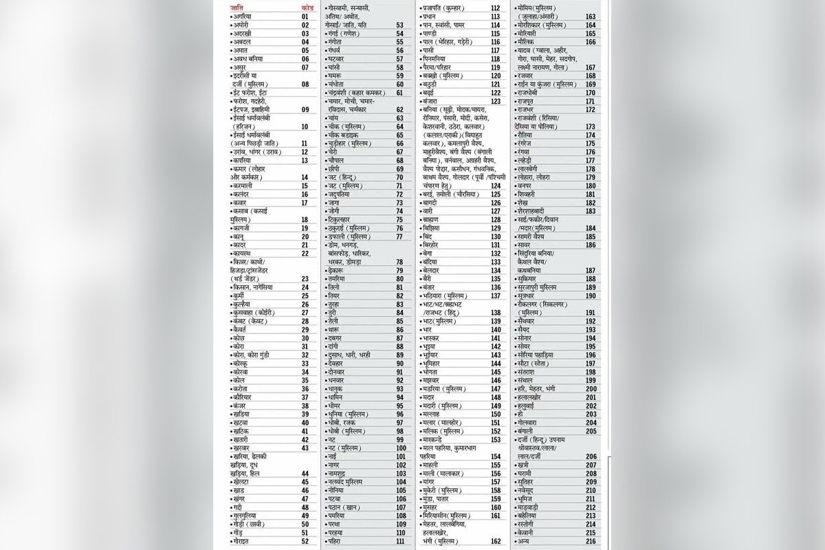 Among the 126 castes, the Kayastha, Brahmin, Rajput, and Bhumihar castes will be identified with their respective assigned codes –22, 128, 171, and 144. Code number 1 has been assigned to the Agrahari community while code number 126 will be allotted to ‘Others’ – social groups not listed by the government. The Kevani caste will be identified through code number 215.