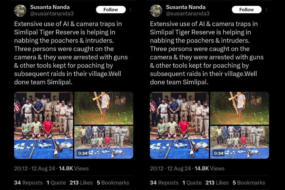 In a tweet, Nanda posted the pictures and videos of the poachers and praised the reserve’s efforts, stating, “Extensive use of AI & camera traps in Simlipal Tiger Reserve is helping in nabbing the poachers & intruders. Three persons were caught on camera & they were arrested with guns & other tools kept for poaching by subsequent raids in their village. Well done team Simlipal.”