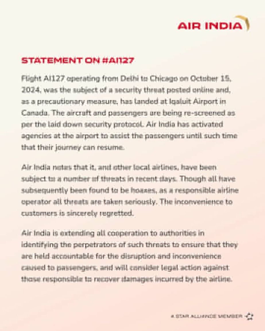 NEW DELHI – An Air India flight, A1127, en route from Delhi to Chicago, was diverted to Iqaluit Airport in Canada after a security threat was posted online. The airline confirmed that the diversion was a precautionary measure to ensure the safety of the passengers and crew. All onboard are reported to be safe.