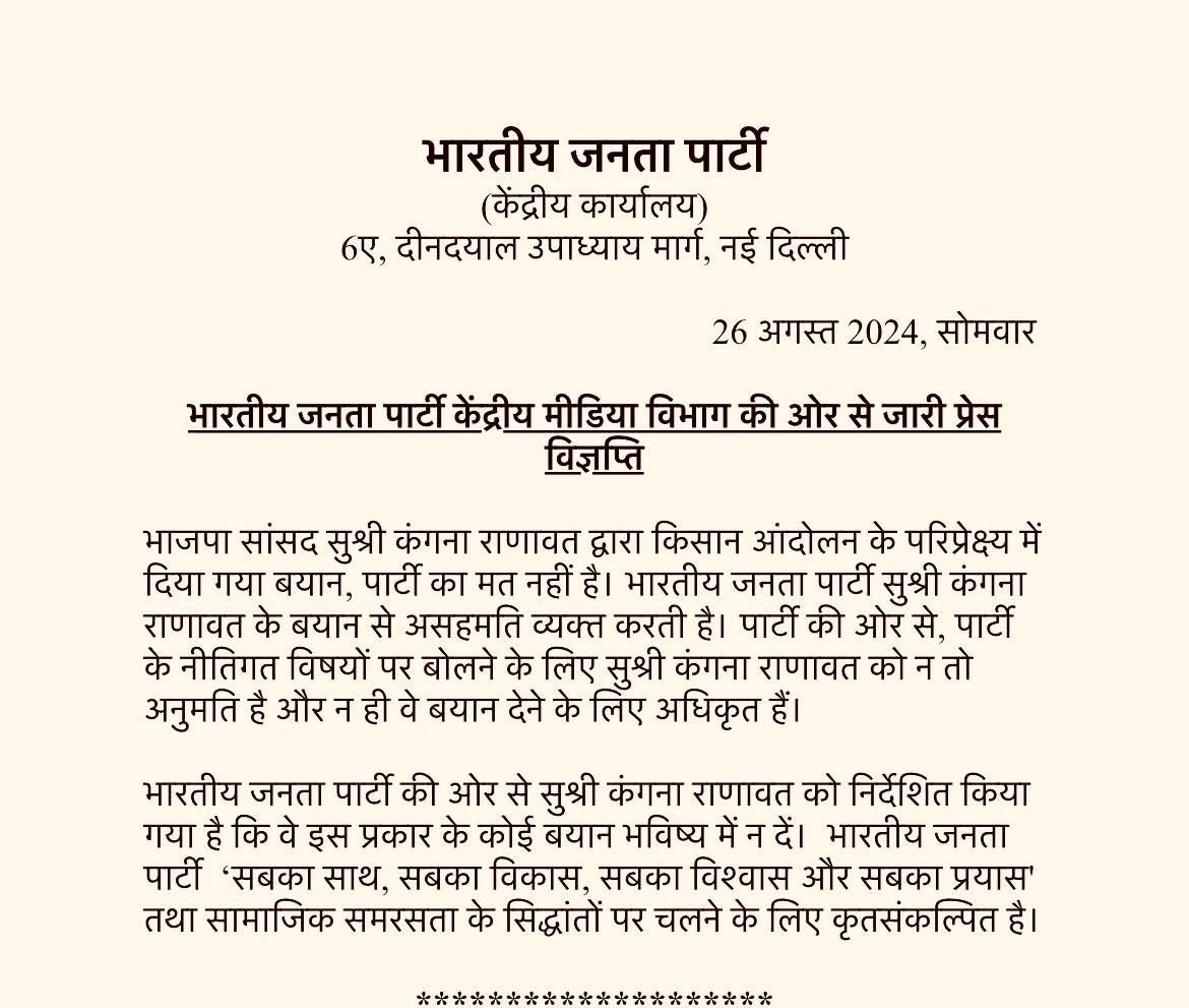 BJP has officially distanced itself from recent controversial remarks made by its Member of Parliament, Kangana Ranaut, regarding the farmers’ protest. In a press release issued today, the BJP clarified that Ranaut’s statements do not reflect the party’s position.