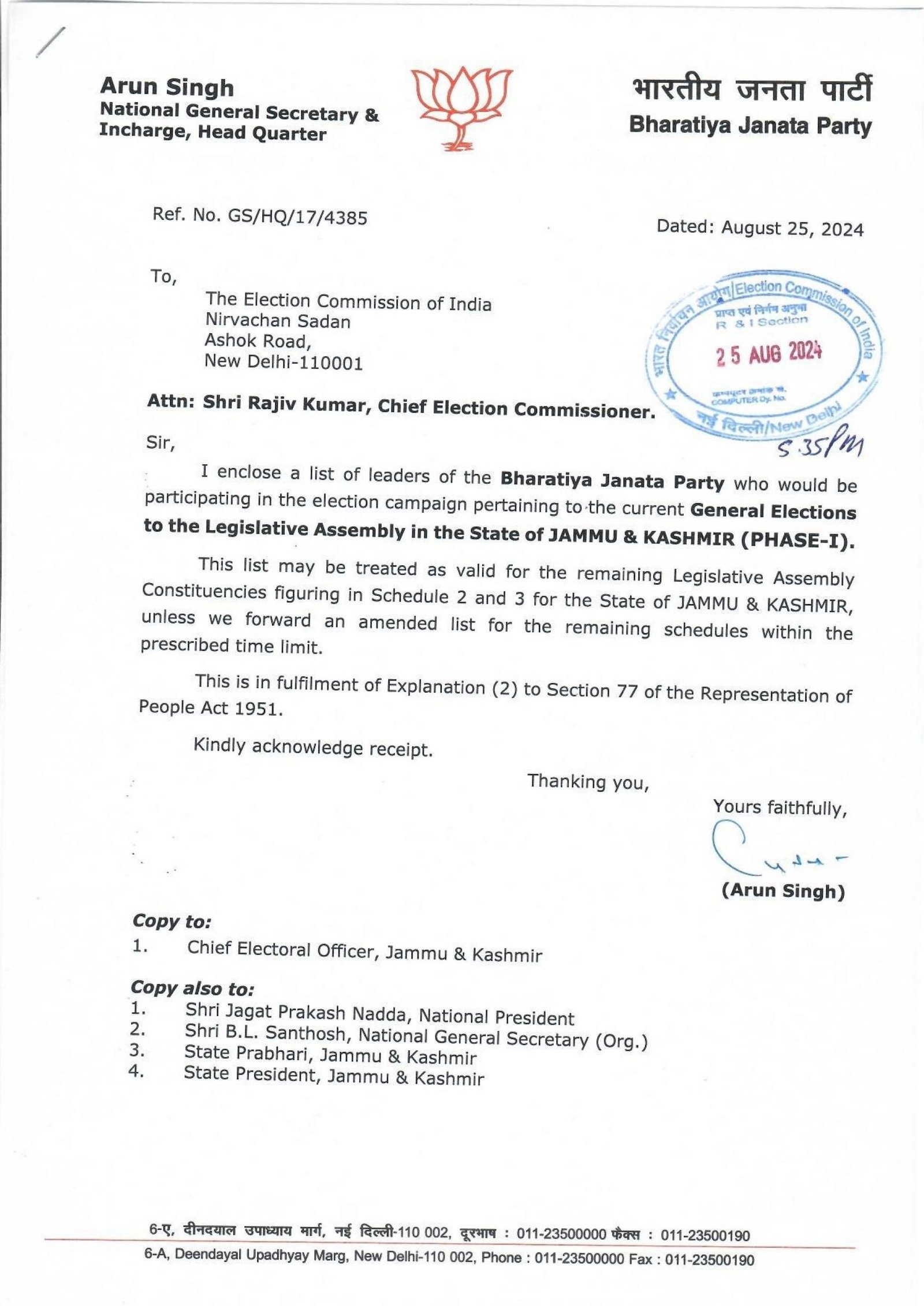 According to a communication from BJP National General Secretary Arun Singh to CEC Rajiv Kumar, the list will remain valid for the remaining Legislative Assembly constituencies listed in Schedules 2 and 3 for the State of J&K, unless an updated list is submitted within the designated time frame.