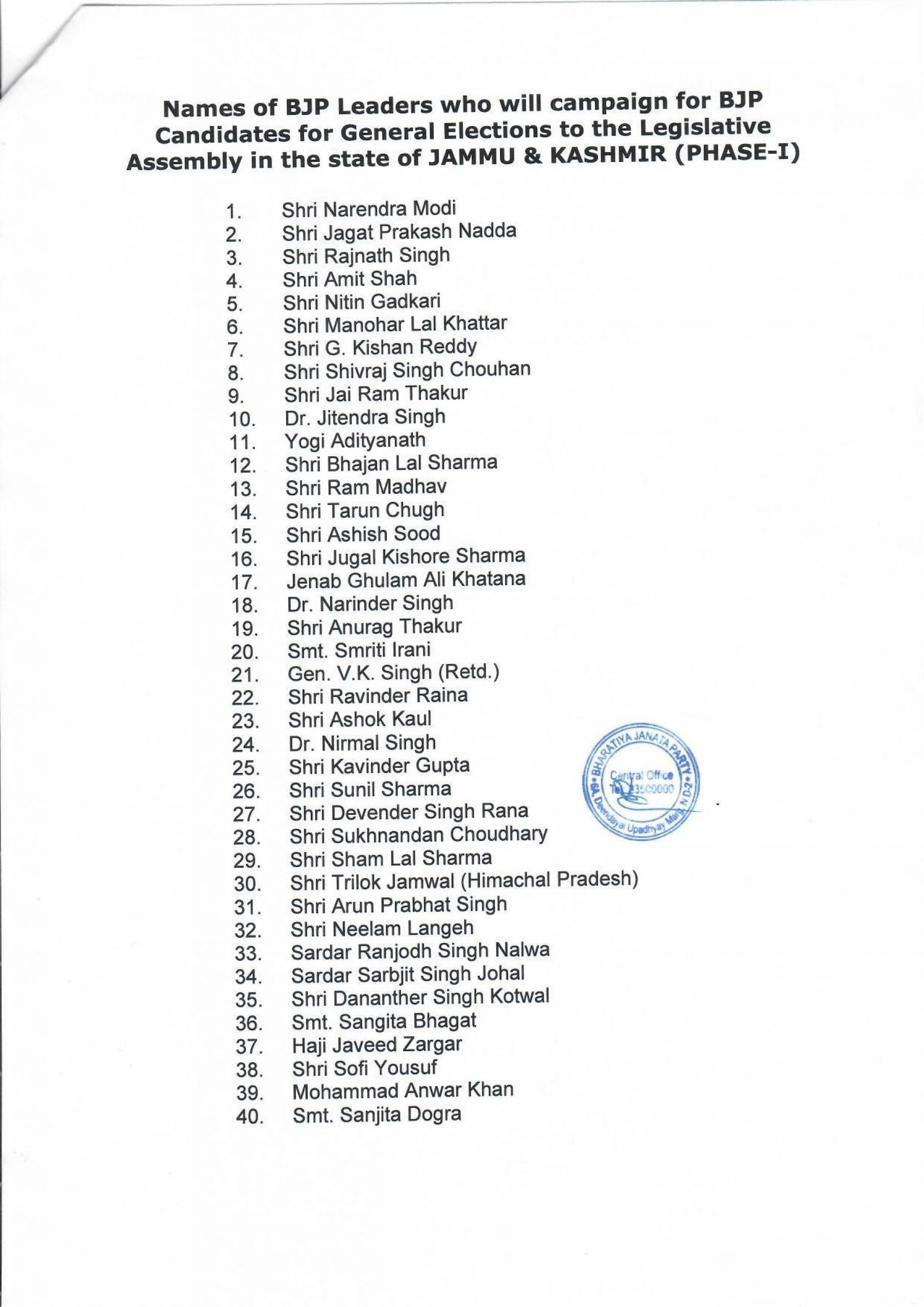 A roster of 40 BJP leaders set to participate in the election campaign for Phase-I of the General Elections to the Legislative Assembly in J&K has been submitted by the party to the Election Commission of India, in accordance with Explanation (2) to Section 77 of the Representation of People Act 1951.