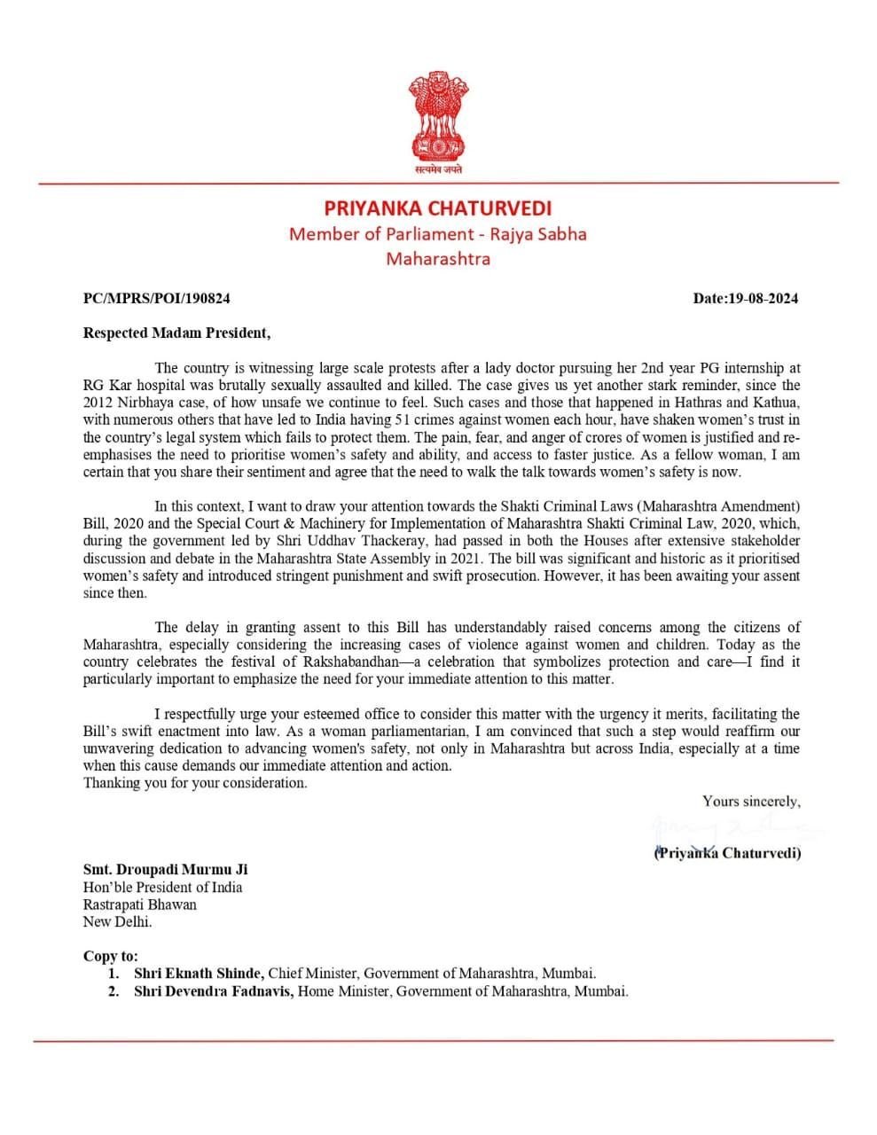 The MP took to X (formerly Twitter) on the occasion of Raksha Bandhan, stating, “On the auspicious day of Raksha Bandhan, I have written a letter to Honourable President Droupadi Murmu ji, asking her to expedite the assent to the Maharashtra Shakti Criminal Law (Maharashtra Amendment) Act, 2020, and the Special Court & Machinery for Implementation of Maharashtra Shakti Criminal Law, 2020, which, under the leadership of Uddhav Balasaheb Thackeray ji, was cleared in the state assembly and has been awaiting her assent ever since. This would be the most fitting gift to the women of the state and the nation on the occasion of Rakhi.”