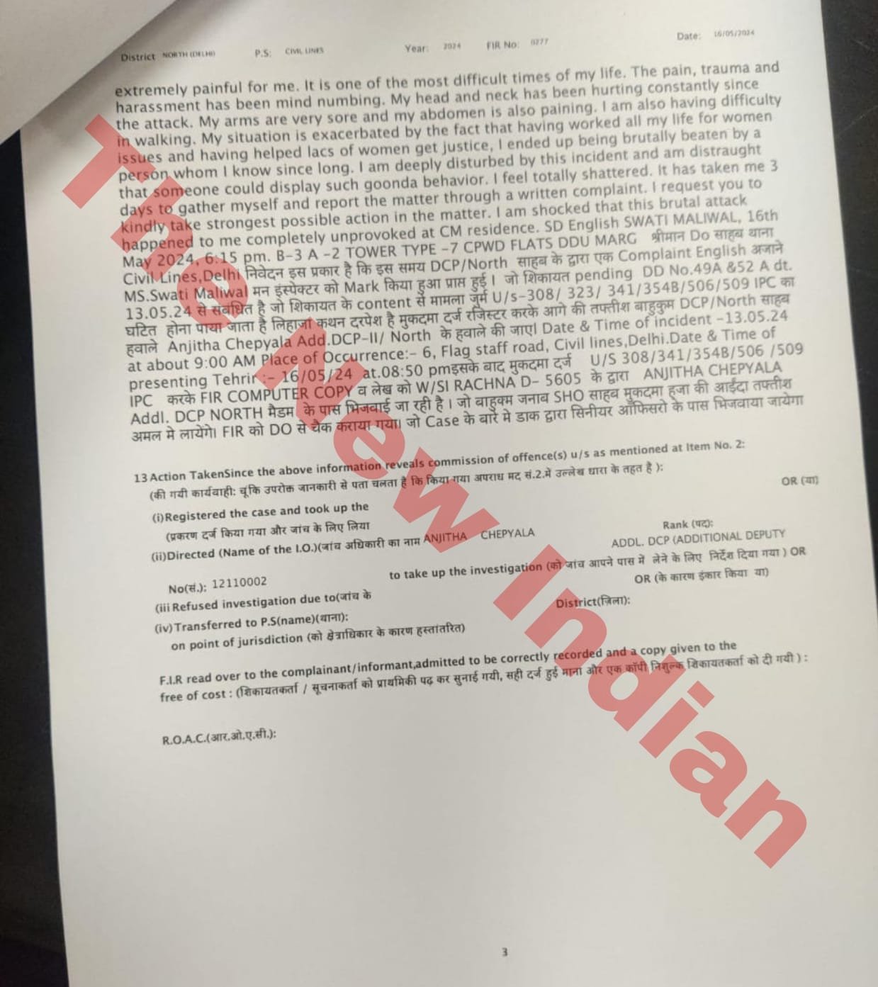 The New Indian accessed the FIR, which details the victim’s ordeal. Maliwal stated that she was on her period when the attack occurred.