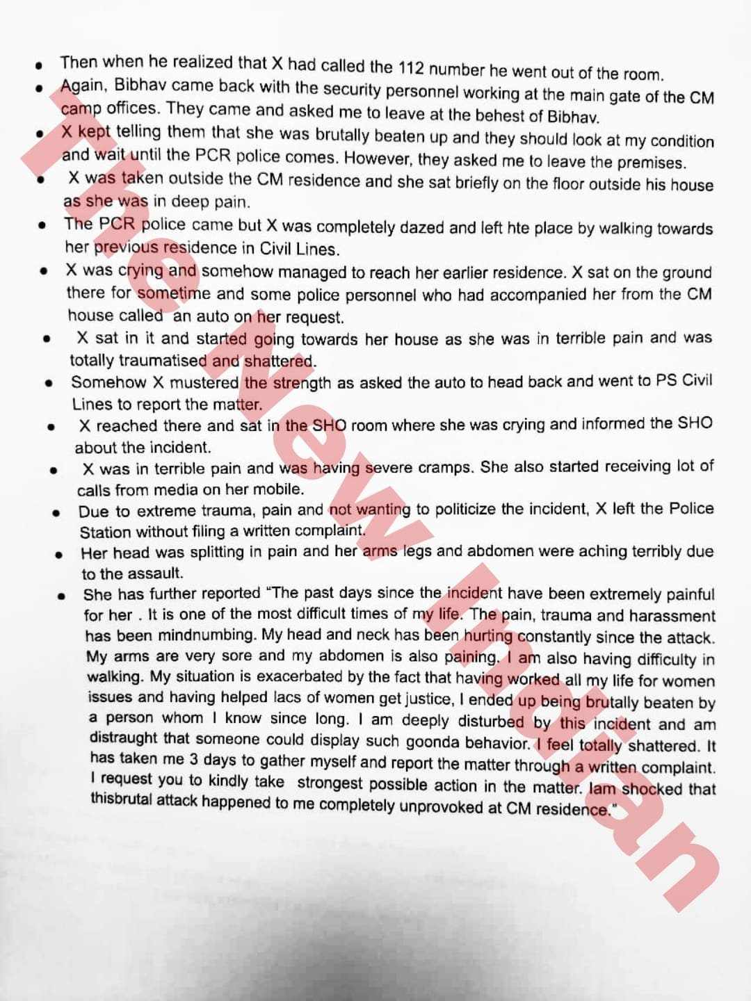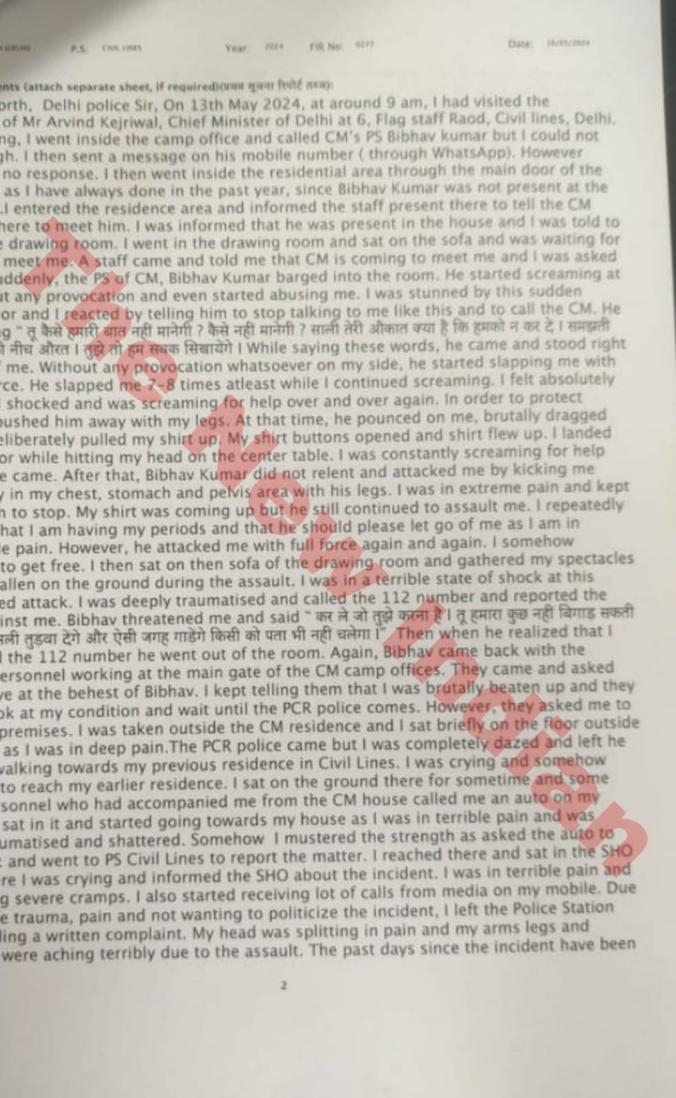 “I was stunned by this sudden behavior and reacted by telling him to stop talking to me like this and to call the CM. Bibhav called me ‘Saali.’ He said I was a low-category woman and how I dared not obey them. He then started slapping me on my face. He slapped me at least 7-8 times while I continued screaming. I felt absolutely shocked and was screaming for help over and over again. In order to protect myself, I pushed him away with my legs. At that time, he pounced on me, brutally dragged me, and pulled my shirt up. My shirt buttons opened, and the shirt flew up. I was constantly screaming for help. Bibhav Kumar did not relent and attacked me by kicking me in my chest, stomach, and pelvis area with his legs. I was in extreme pain. My shirt was coming up, but he continued to assault me. I was taken outside the CM residence and sat on the floor outside as I was in deep pain. The PCR police came, but I was completely dazed and left, walking towards my previous residence in Civil Lines. I was crying and somehow reached my earlier residence,” read the FIR.