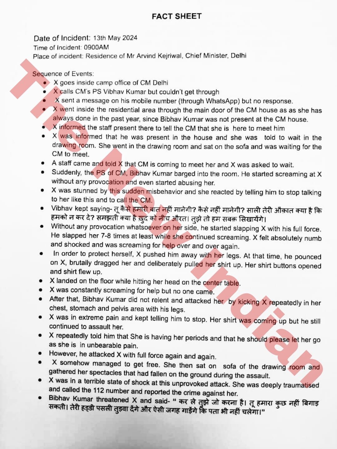The Police have also prepared a fact sheet which says that the victim, in order to protect herself, pushed Bibhav away with her legs. At that time, the accused pounced on her, brutally dragged her, and deliberately pulled her shirt up. Her shirt buttons opened, and the shirt flew up.