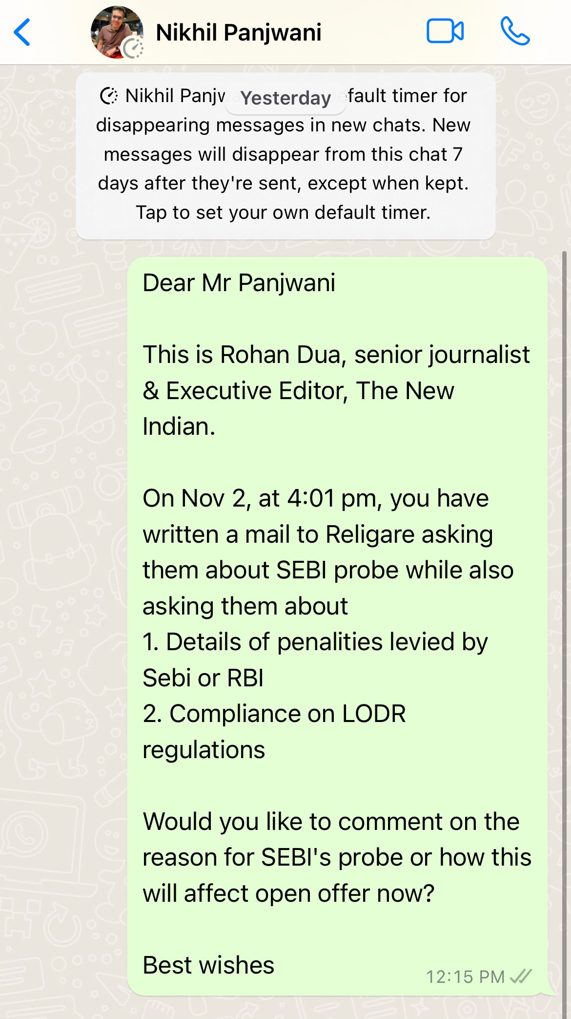 A screenshot of text message sent by The New Indian to J M Financials’ Nikhil Panjwani. He did not reply to these queries on charges of possible violations and accusations of market manipulations and subsequent probe by SEBI.