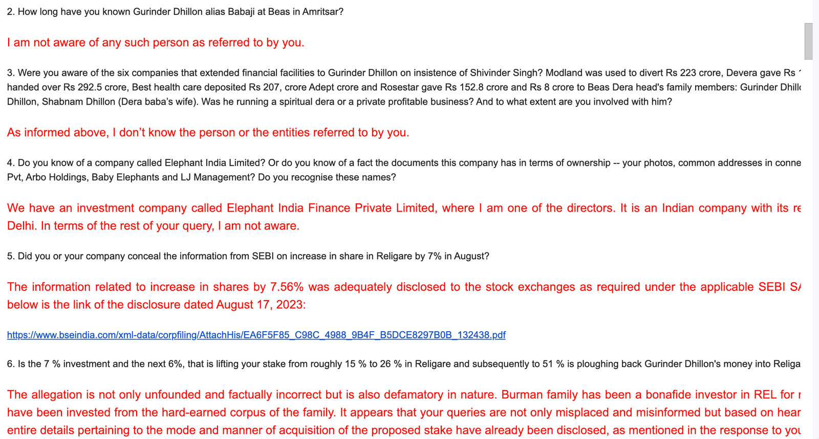 “….Please find below the extract of queries shared by SEBI…..1. Details of complaints received by merchant banker, if any 2. Details of penalties levelled by SEBI and RBI against the target company/promoters/manager to the offer and RTA including current status of such actions details of penalty paid. 4. Compliance status in respect of the target company with listing requirements/LODR requirements and penal actions including those levied by stock exchanges. 5. Are there any depository receipts of the shares issued in foreign countries? If yes, elaborate the process that will be adopted for tendering of those shares by the shareholders/ in other countries,” a mail by Nikhil Panjwani, on behalf of J M Financial, to Reema Jayara, Arjun Mehra and Rohang Narain at 4:01 PM on November 4, 2023, confirmed SEBI’s gamut of investigations into the entire acquisition process of Religare by the Burman family amid accusations of malpractices.
