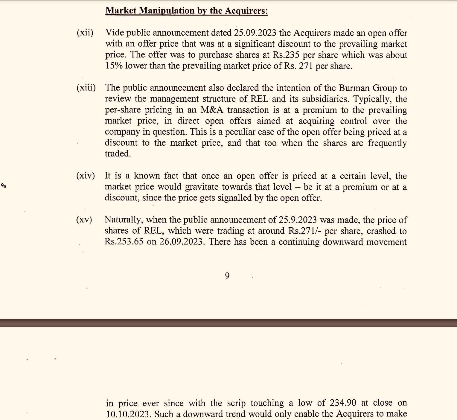 “In the foregoing circumstances, it is highly probable that the present hostile takeover of REL has been carefully planned by the Burman Group. The Burman group acquired about 7.5 % of REL shares in the month of August 2023. It is verily believed that the Burman Group has there after persuaded various persons to purchase shares of REL and after the public announcement on September 25, 2023 to sell the shares so purchased at the proposed offer price of Rs 235 in order to ensure that the value of the scrip which was Rs 271.55 per share on September 29, 2023, drops consistently to the proposed offer value of, that is Rs 235 per share,” the complaint has said.