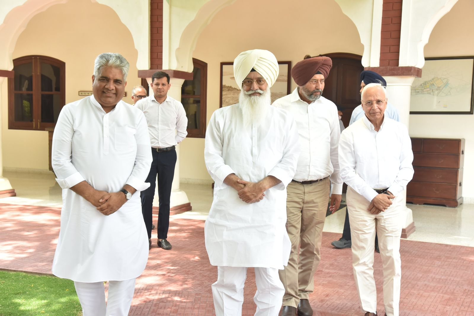 A file photo from May 2023 when Union environment minister Bhupendra Yadav visited Gurinder Dhillon at Radha Soami Beas Satsang in Amritsar
