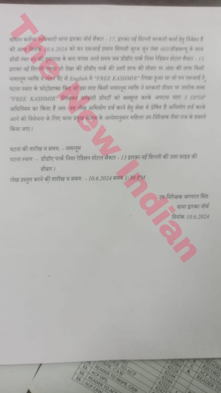 The police were alerted to the incident on June 10, when they received a call reporting anti-India slogan written on the wall of DDA flats in Dwarka Sector 13. Upon investigation, the police found the ‘Free Kashmir’ graffiti on the wall, as reported by a senior police official.