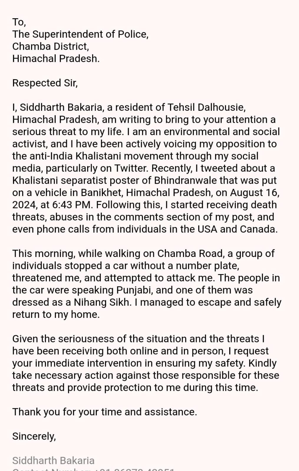 “I, Siddharth Bakaria, a resident of Tehsil Dalhousie, Himachal Pradesh, am writing to bring to your attention a serious threat to my life. I am an environmental and social activist, and I have been actively voicing my opposition to the anti-India Khalistani movement through my social media, particularly on Twitter. Recently, I tweeted about a Khalistani separatist poster of Bhindranwale that was put on a vehicle in Banikhet, Himachal Pradesh, on August 16, 2024, at 6:43 PM. Following this, I started receiving death threats, abuses in the comments section of my post, and even phone calls from individuals in the USA and Canada,” read his complaint.