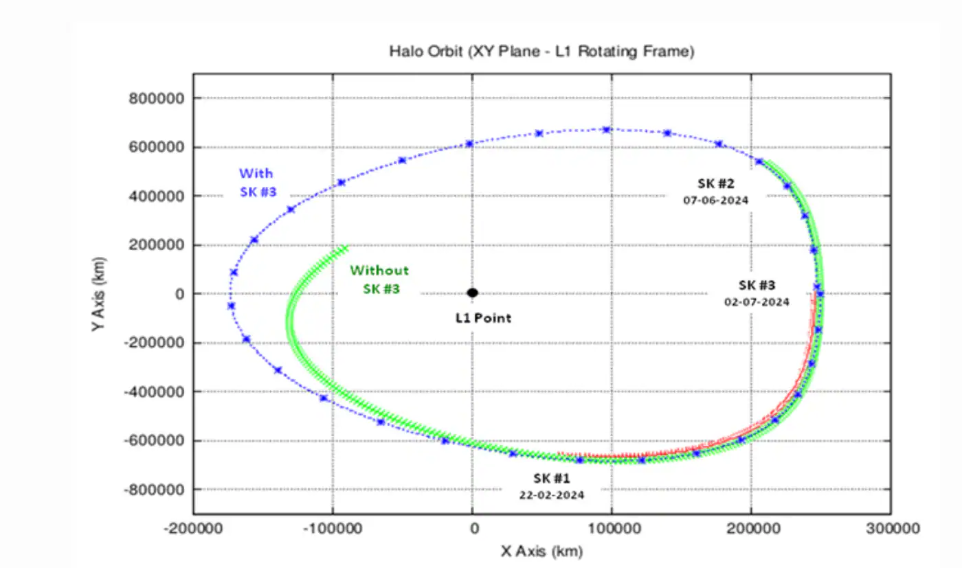 The blue line in the chart represents the spacecraft’s orbit around L1, viewed from above. SK#1, SK#2, and SK#3 are the adjustments made to keep it on course. The final adjustment on July 2 ensured it stayed in the correct orbit, preventing it from drifting along the green path. The X and Y axes show distances in kilometers, with L1 at the center.