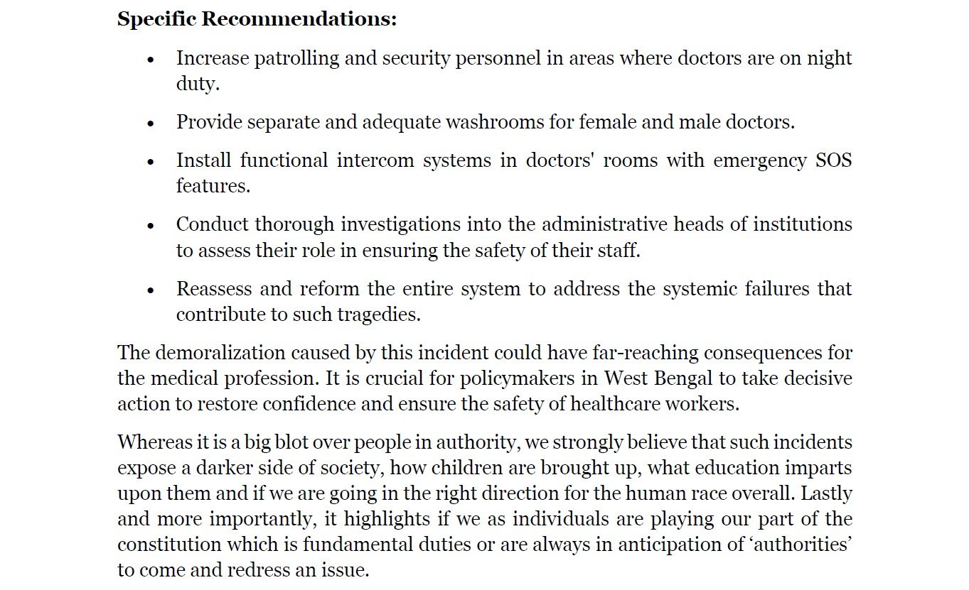 The signatories made several recommendations, including increasing security for doctors on night duty, improving infrastructure for female doctors, and conducting thorough investigations into the roles of administrative heads in ensuring staff safety. They also stressed the need for societal change to uphold gender equality and family values.