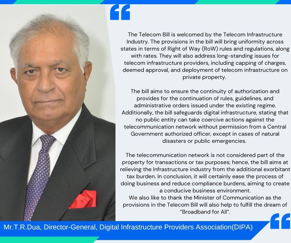 TR Dua, the Director General of the Digital Infrastructure Providers Association, hailed the move for safeguarding civilians from public entities taking control of their means of communication. “The bill safeguards digital infrastructure, stating that no public entity can take coercive actions against the telecommunication network without permission from a Central Government authorised officer, except in cases of natural disasters or public emergencies,” he said.