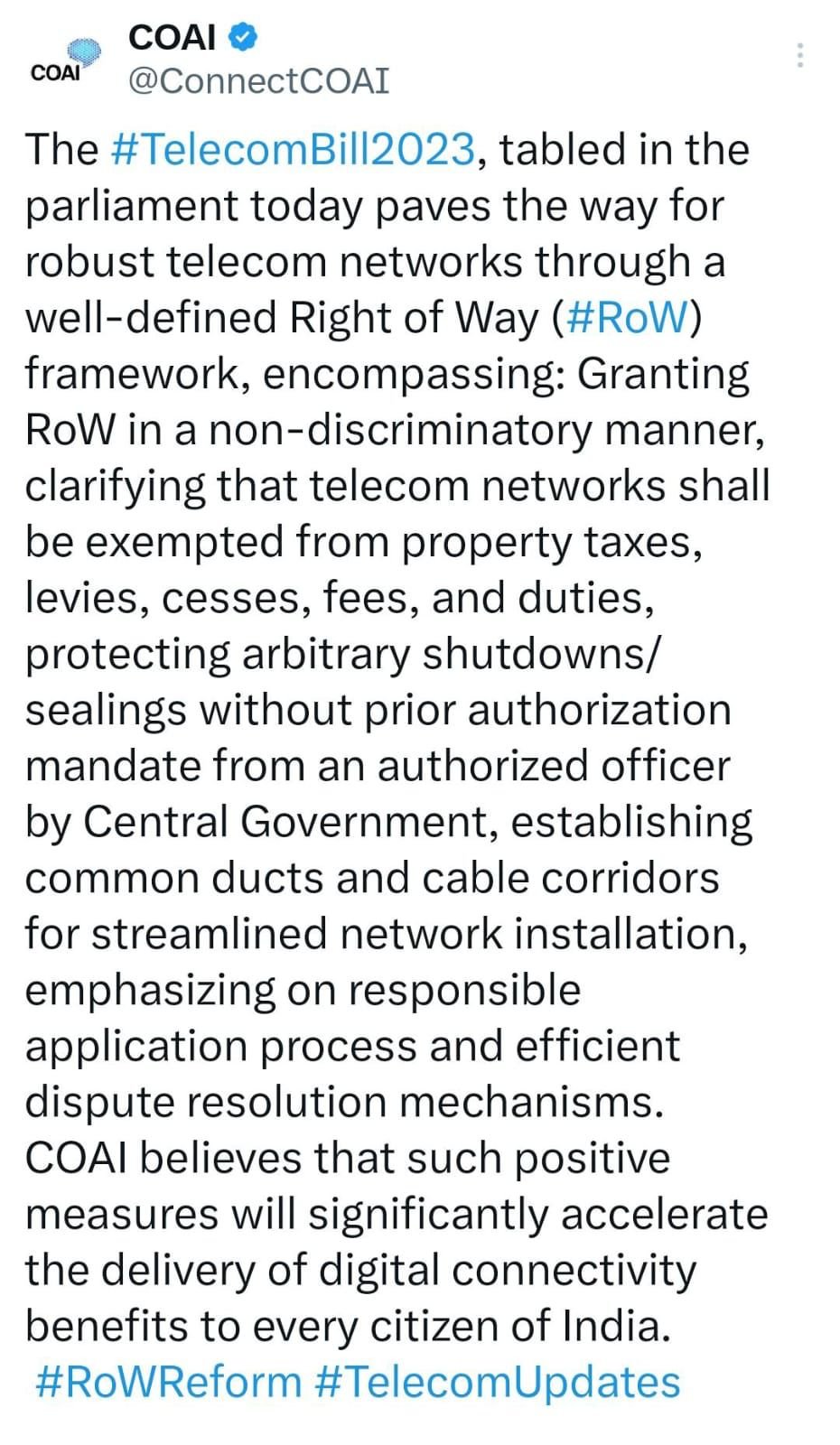 The Cellular Operators Association of India also highlighted how the Bill formulates a well-defined and robust Right of Way. Taking to microblogging site, X, it stated, “COAI believes that such positive measures will significantly accelerate the delivery of benefits of digital connectivity to every citizen of India.”