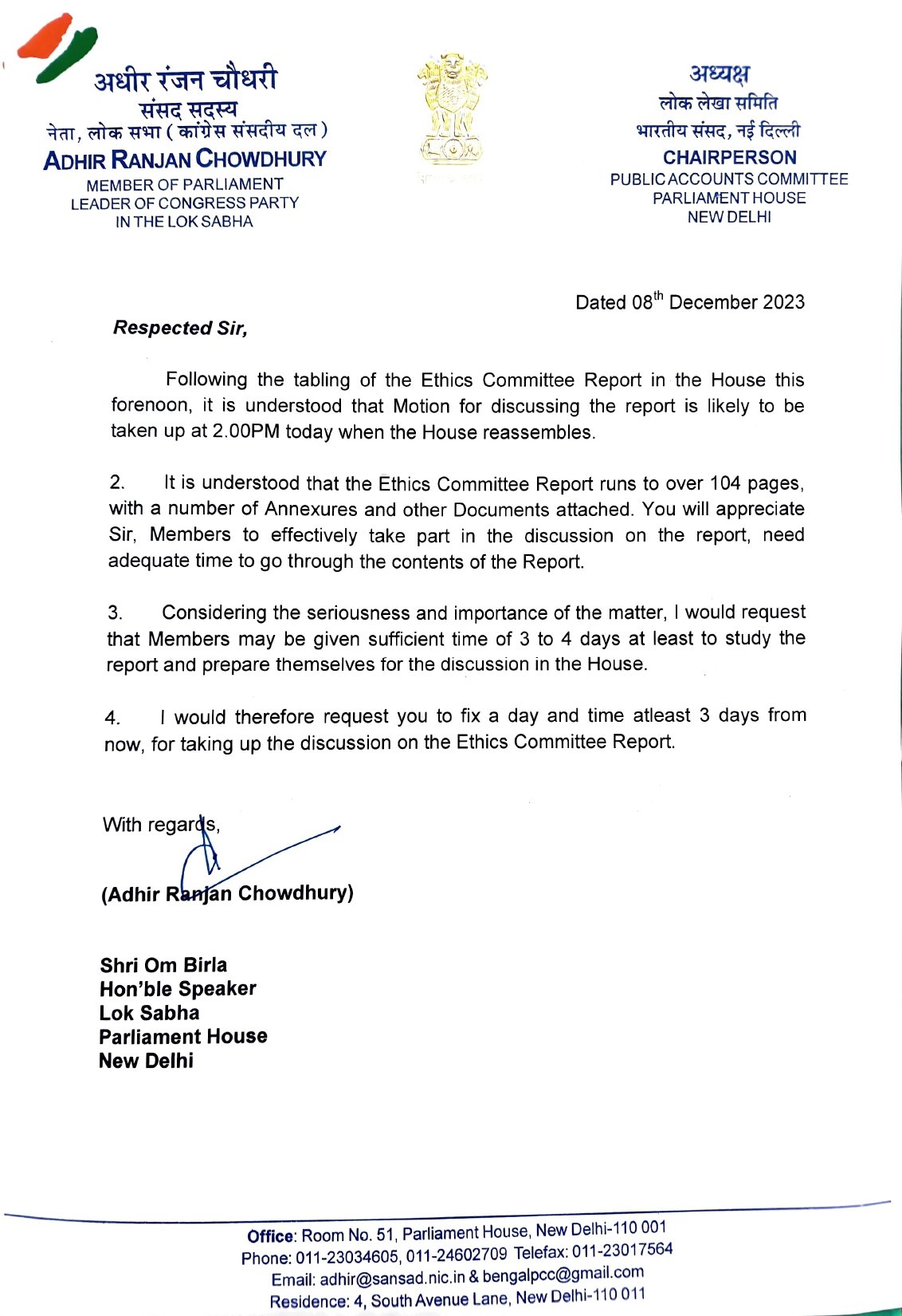 Leader of Opposition and Lok Sabha MP Adhir Ranjan Chowdhury had also sent a letter to the Lok Sabha Speaker prior to the hearing, stating that at least three to four days should be given to the MPs to decide upon her expulsion.