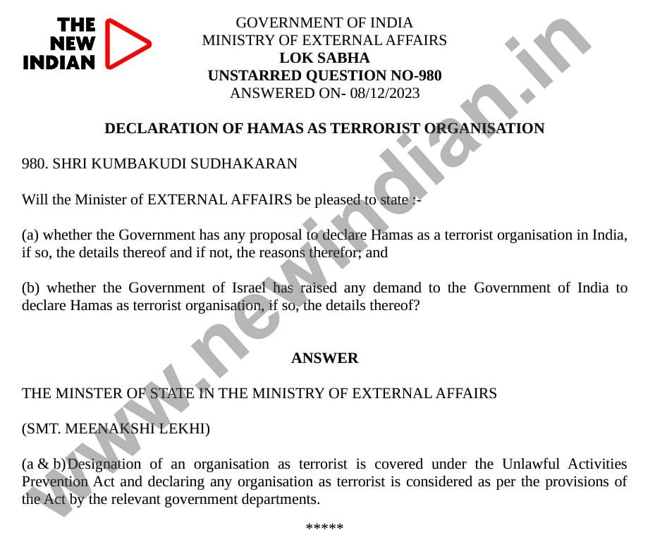 FLASH: A Parliament document has come to light that states Unstarred question no 980 by Congress MP from Kerala Kumbakudi Sudhakaran. This question was on declaration of Hamas as terrorist organisation with a question.