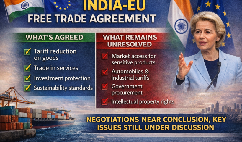 India and the European Union on Monday finalized a landmark Free Trade Agreement (FTA) at the 16th India-EU Summit. The deal is poised to double bilateral trade from its current €120 billion in goods and €59.7 billion in services to over €250 billion within a decade.