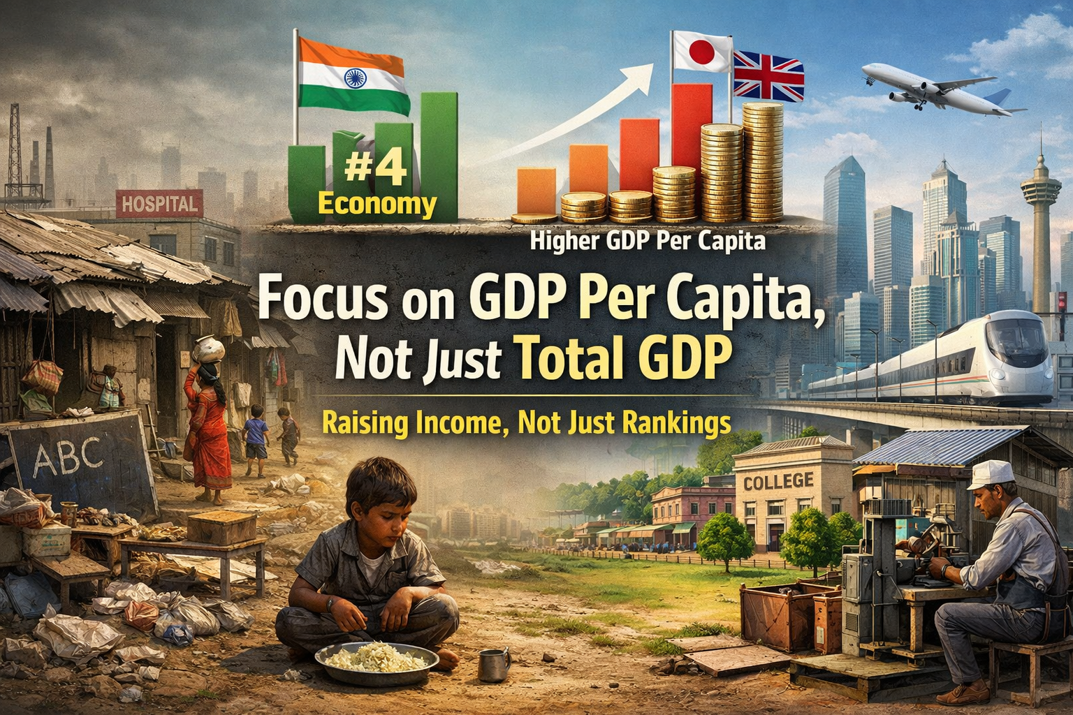 If India wants its economic rise to be meaningful, GDP per capita must become the central policy obsession. That requires a sharp pivot. First, India must massively expand labour-intensive manufacturing—textiles, electronics, food processing, green technologies—at scale, not through isolated schemes. Second, education and skills need urgent repair: fewer unemployable degrees, more vocational training, and serious investment in public universities, research, and teacher quality. Third, health spending must rise decisively. A healthier workforce is not a welfare expense; it is economic infrastructure.