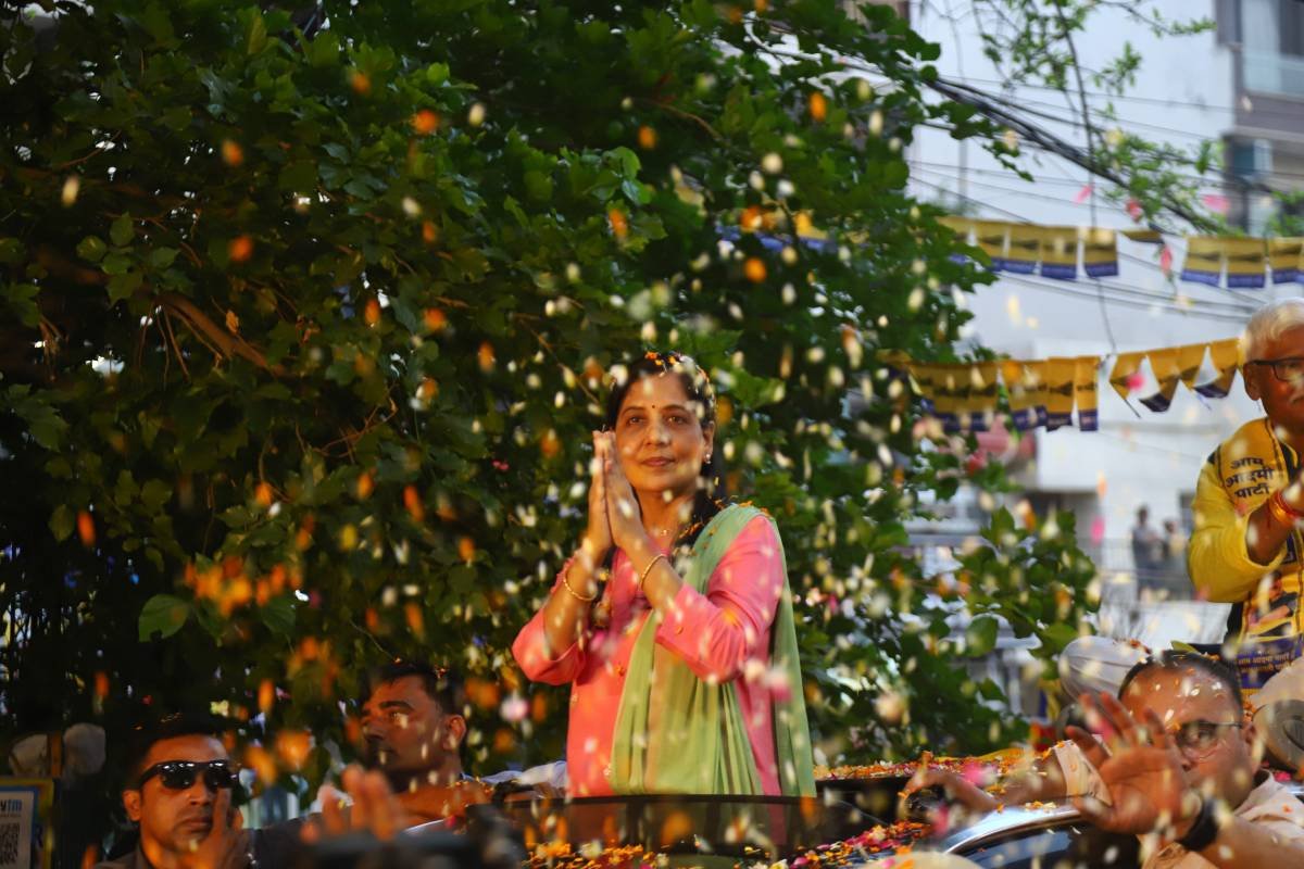 Sunita Kejriwal leads her first campaign in Delhi after Arvind Kejriwal’s arrest, rallying support and addressing the crowd with determination (Photo by Sumit Kumar)