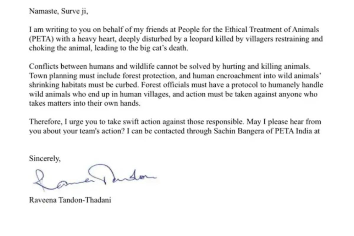 In her letter, Raveena Tandon emphasized the need for humane solutions to human-wildlife conflicts. “Conflicts between humans and wildlife cannot be solved by hurting and killing animals. Town planning must include forest protection and human encroachment into wild animals’ shrinking habitats must be curbed,” she wrote. Tandon also stressed the importance of forest officials having protocols to humanely handle wild animals that end up in human villages and taking action against those who take matters into their own hands.