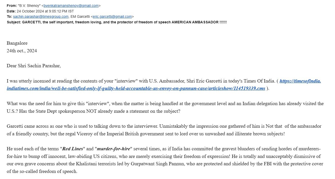 NEW DELHI: In a letter addressed to The Times of India and its journalist Sachin Parashar, a reader B.V. Shenoy has expressed outrage over the interview with U.S. Ambassador Eric Garcetti published in the paper.