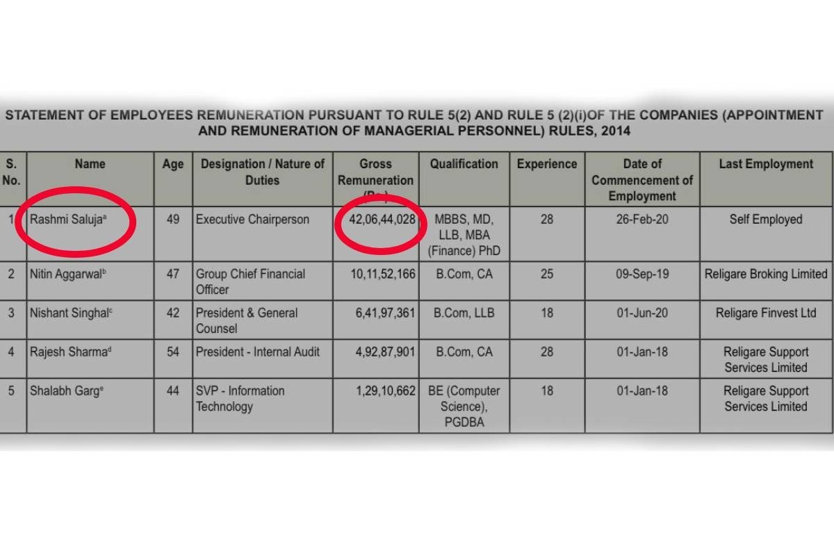 In 2023, Saluja sought a further 10% increase in her remuneration, taking her salary four-fold to the next in-command Nitin Aggarwal, who serves Religare as Group Chief Financial officer (at Rs 10.11 crore), followed by Nishant Singhal (Rs 6.41 crore as President and general counsel), Rajesh Sharma (Rs 4.29 crore as President for internal audit) and Shalabh Garg (Rs 1.29 crore as SVP for information technology).