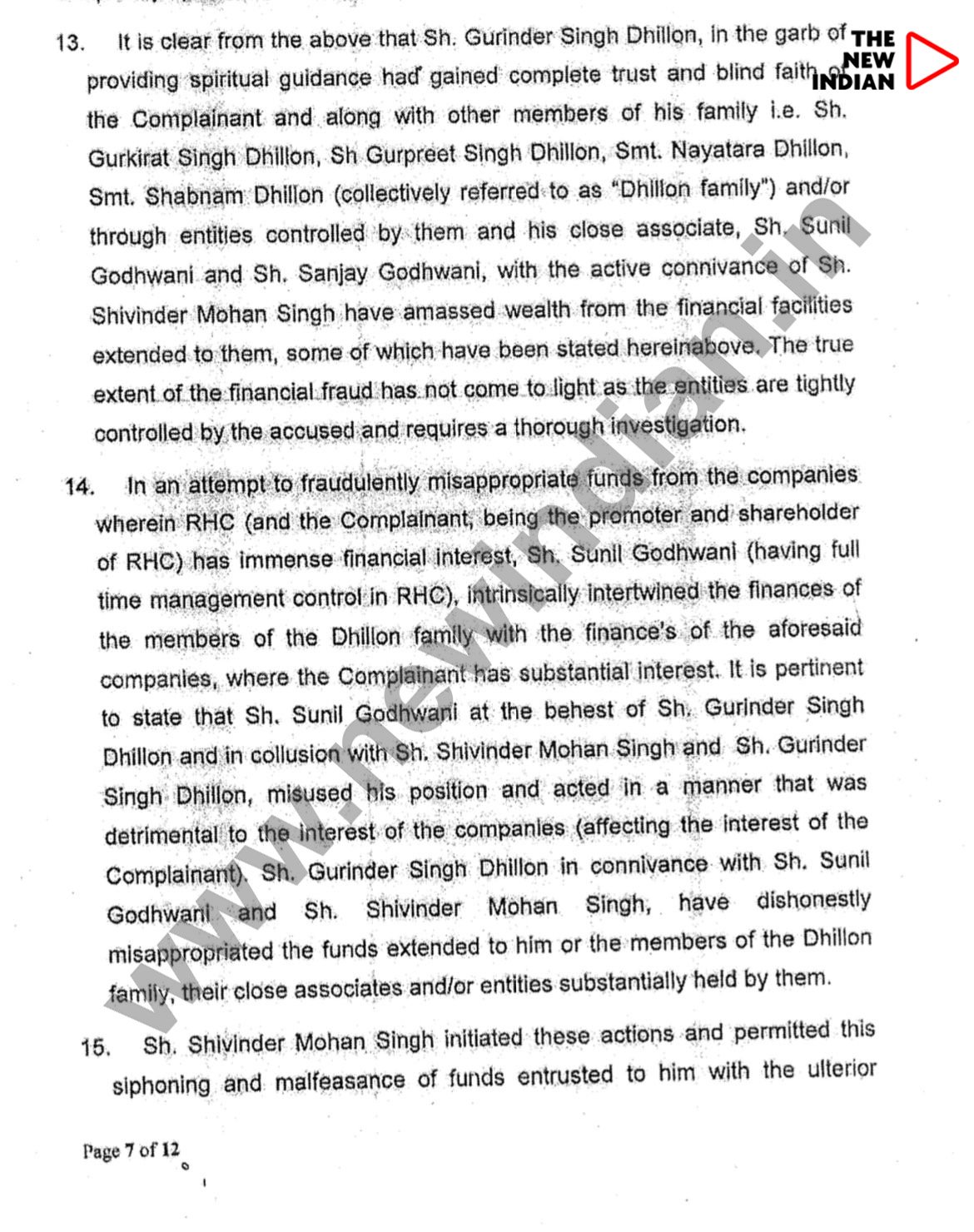 The complaint further alleges that in December 2017, Shivinder, while misusing his position in RHC, concealed the precarious financial status of the six companies whose money were allegedly transferred into Radha Soami family members.
