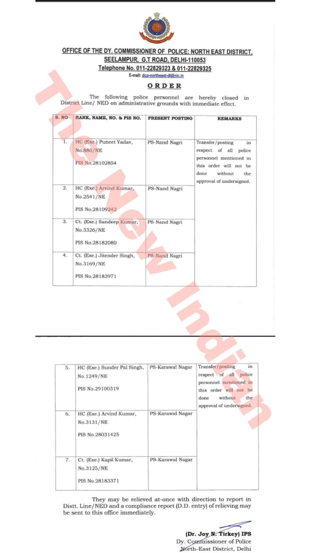 Previously, Inspector Pramod Anand, the SHO of Kalkaji Police Station, was transferred to district lines as a disciplinary measure following the arrest of a Sub-Inspector from the same station by the CBI for accepting a bribe.