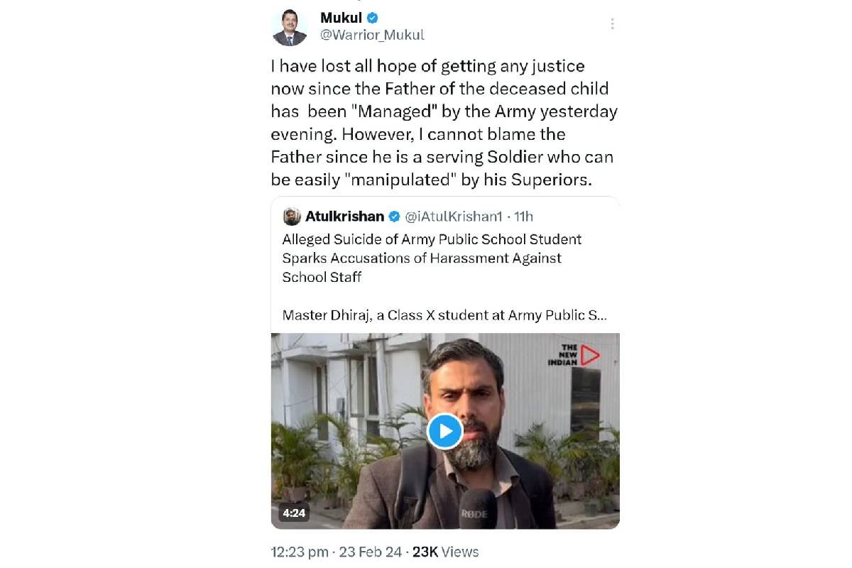 “I have lost all hope of getting any justice now since the Father of the deceased child has been “Managed” by the Army yesterday evening. However, I cannot blame the Father since he is a serving Soldier who can be easily “manipulated” by his Superiors,” Mukul Posted on X.