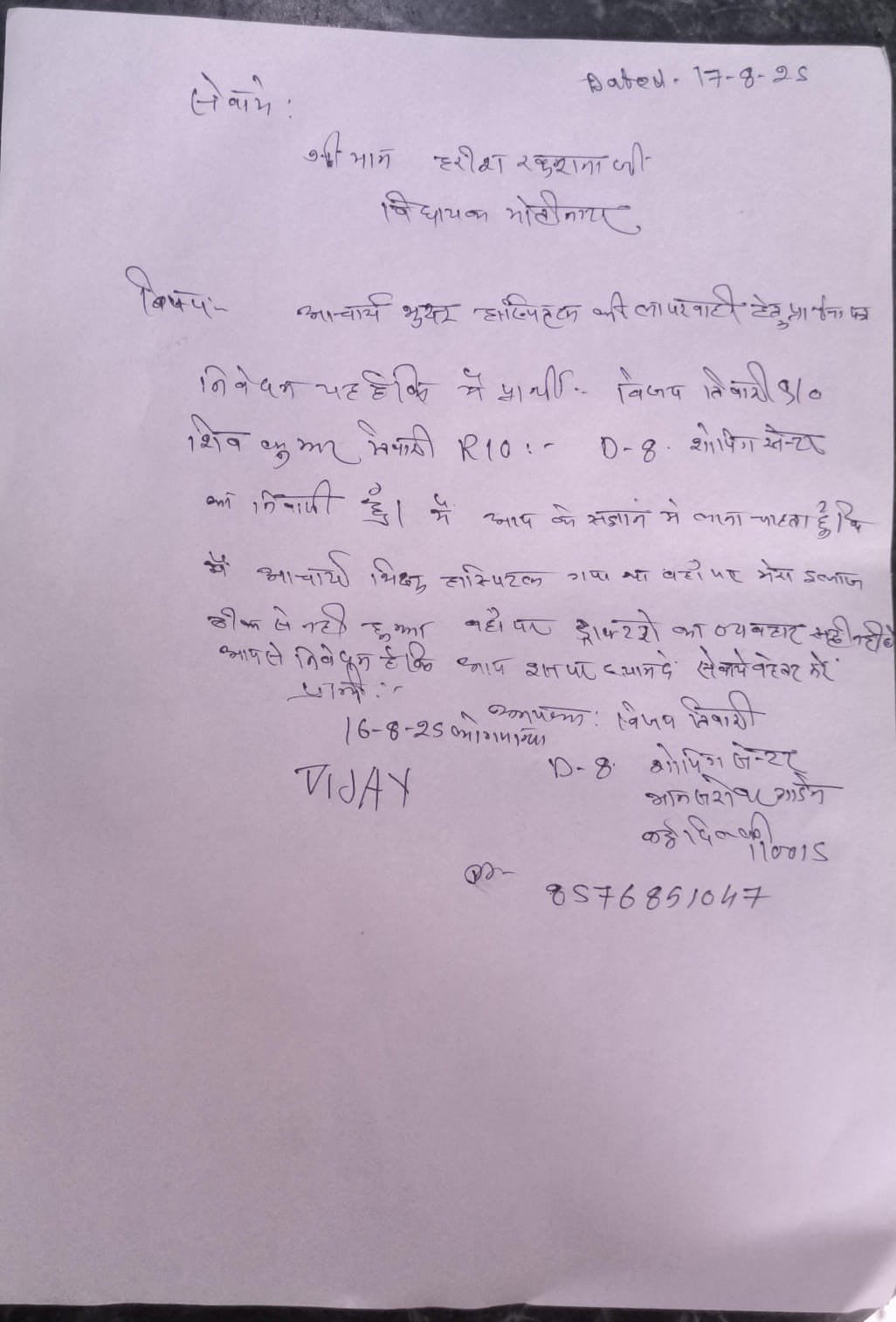 • August 17, 2025 – Vijay complained that hospital toilets were unsanitary despite a ₹10 usage charge, seeking Khurana’s intervention.Harish Khurana