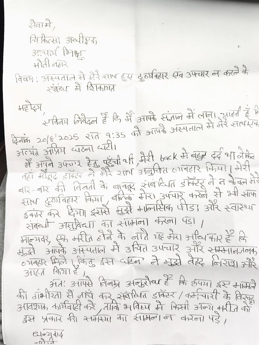 • August 20, 2025 – Emergency Case Complaint: A 42-year-old patient named Jyoti was registered with severe back pain. She later submitted a written complaint alleging denial of treatment, staff misbehavior, and “mental distress.”Harish Khurana