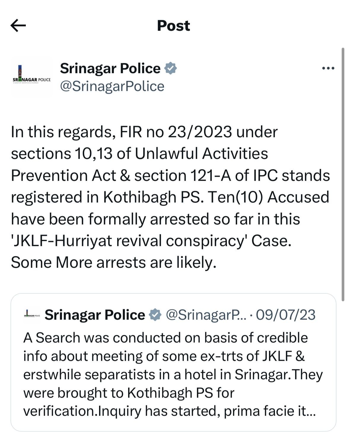 In a statement, the police said the meeting at the Srinagar hotel was an “attempt to start working for revival of dying secessionist organisations”.