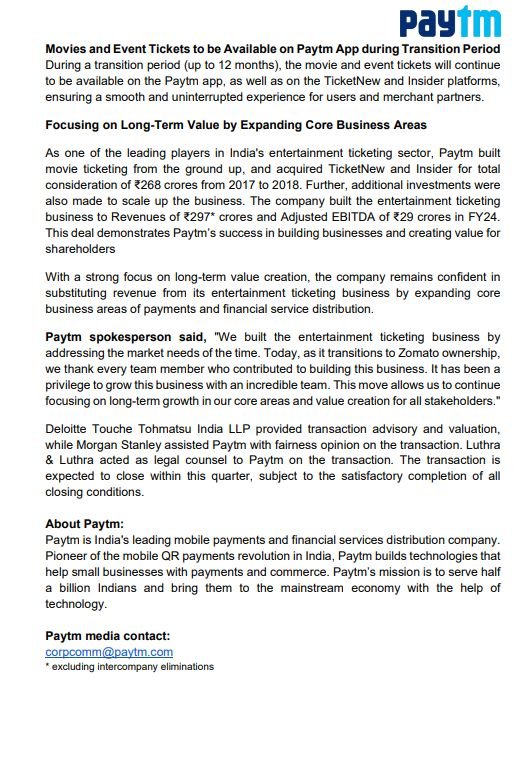 The transaction includes the transfer of Paytm’s entertainment ticketing business, encompassing movies, sports, and event ticketing, to its 100% subsidiaries, Orbgen Technologies Pvt. Limited (OTPL) and Wasteland Entertainment Pvt. Limited (WEPL). Zomato will acquire these subsidiaries, which operate the TicketNew and Insider platforms, through a share purchase and subscription agreement (SPSA).
