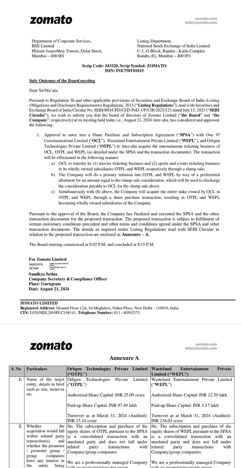 As detailed in the transaction, OCL will first transfer its entertainment ticketing business to OTPL and WEPL. Zomato will then infuse funds into these subsidiaries through a preferential allotment of shares, which will be used to pay the slump sale consideration to OCL.