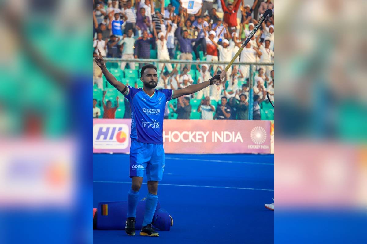 Sukhjeet Singh celebrated after scoring in the PFC India vs. Germany Bilateral Hockey Series 2024 (Photo by Tejasvi Pandey)