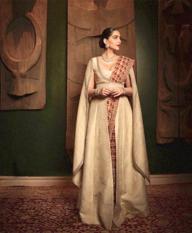 Stepping into the NMACC launch, Sonam Kapoor graced the occasion in a couture saree crafted by JJ Valaya. Her ensemble featured a captivating floral print in red and beige, elegantly draped and adorned with an embellished fabric belt. Adding a touch of regality, she paired it with a beige brocade-embroidered cape jacket, boasting long sleeves and a front slit for a modern twist. To accentuate the ensemble, Sonam adorned herself with a stylish choker, matching earrings, rings, and bracelets.