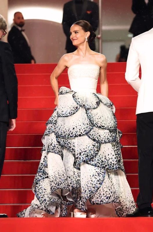 Natalie Portman donned a meticulously adorned ivory strapless gown for an event. The dress, intricately beaded and boasting a layered skirt reminiscent of a fan of eyeless peacock feathers, draws inspiration from the Junon dress that Christian Dior crafted for his 1949-1950 autumn/winter collection. Named after the Ancient Roman goddess, Juno, who was the wife of Jupiter and the patron goddess of Rome, the gown pays homage to Dior’s historical design. While the original Junon dress, created by Christian Dior, is not currently on public display, it holds a significant place in The Metropolitan Museum of Art’s Costume Institute collection.